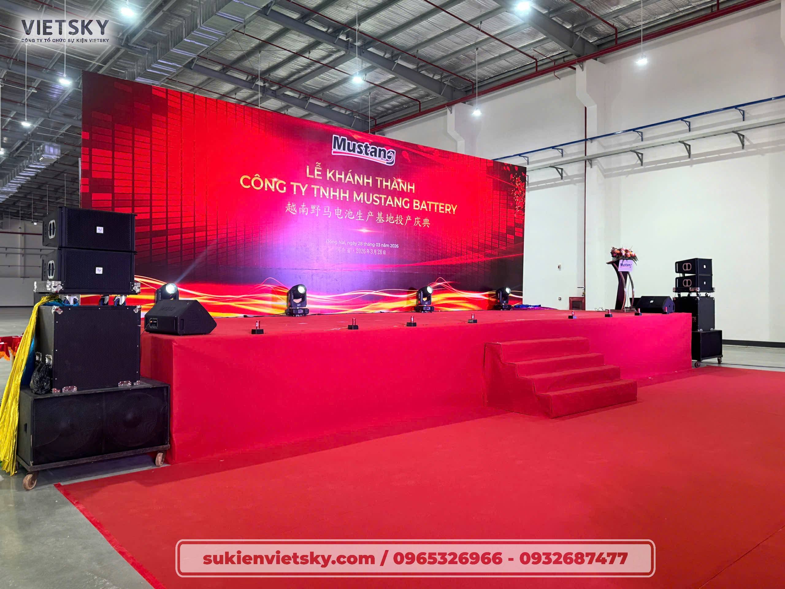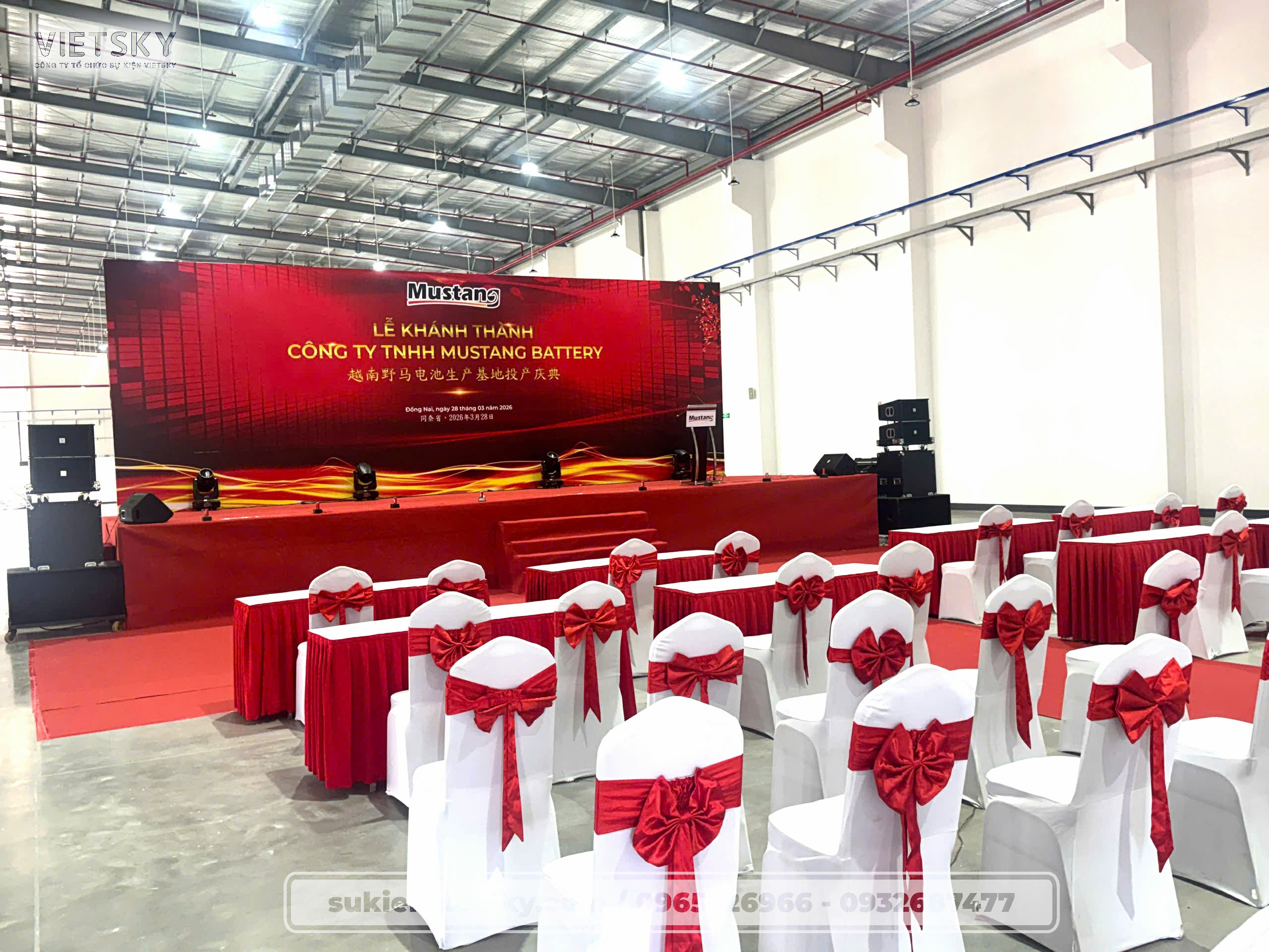 Khu vực sân khấu: Backdrop khổ lớn với thiết kế hiện đại, làm nổi bật logo Mustang và dòng chữ “Lễ Khánh Thành” bằng cả tiếng Việt và tiếng Trung, thể hiện sự giao thoa văn hóa và tầm vóc quốc tế của doanh nghiệp.