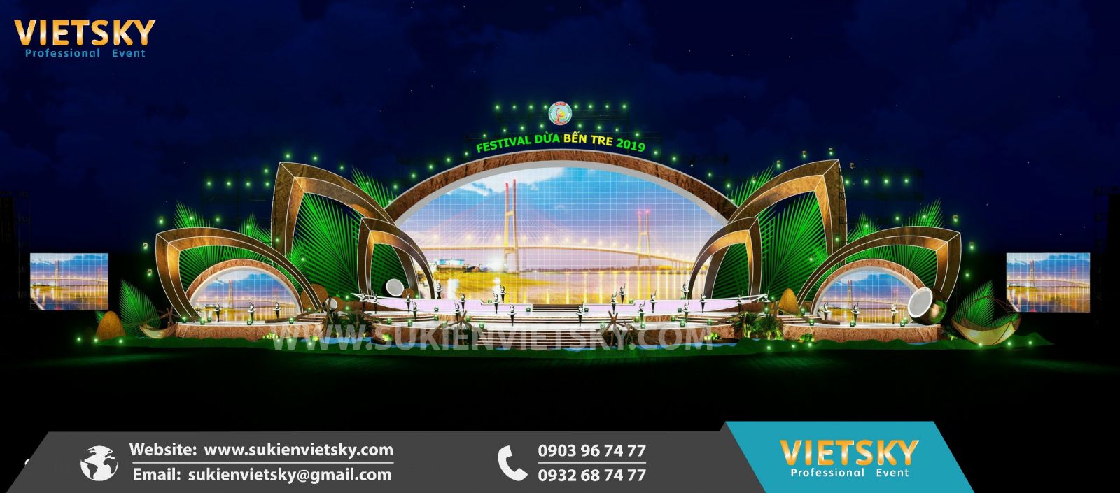 Công ty Tổ chức Sự kiện Việt Sky sở hữu đội ngũ nhân viên giàu kinh nghiệm, sáng tạo và tâm huyết với nghề, có thể đáp ứng mọi yêu cầu của khách hàng, từ trang trí, âm thanh ánh sáng, chương trình nghệ thuật đến hậu cần. Tất cả các dịch vụ được thực hiện bởi đội ngũ nhân viên chuyên nghiệp và đảm bảo chất lượng để khẳng định địa vị của mình trong top các công ty tổ chức sự kiện uy tín tại Bến Tre.